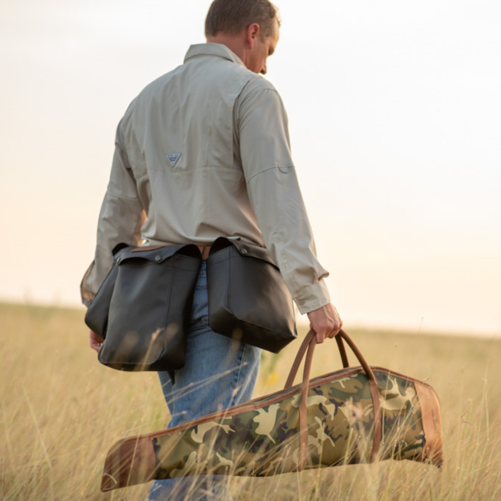 Coated canvas with Oiled Leather trim. Fully lined in fleece for protection. Oiled Leather handles that extend to the base. Zippered closure with antique brass hardware antique brass D-Ring to hang for easy storage easily holds a rifle with a scope.